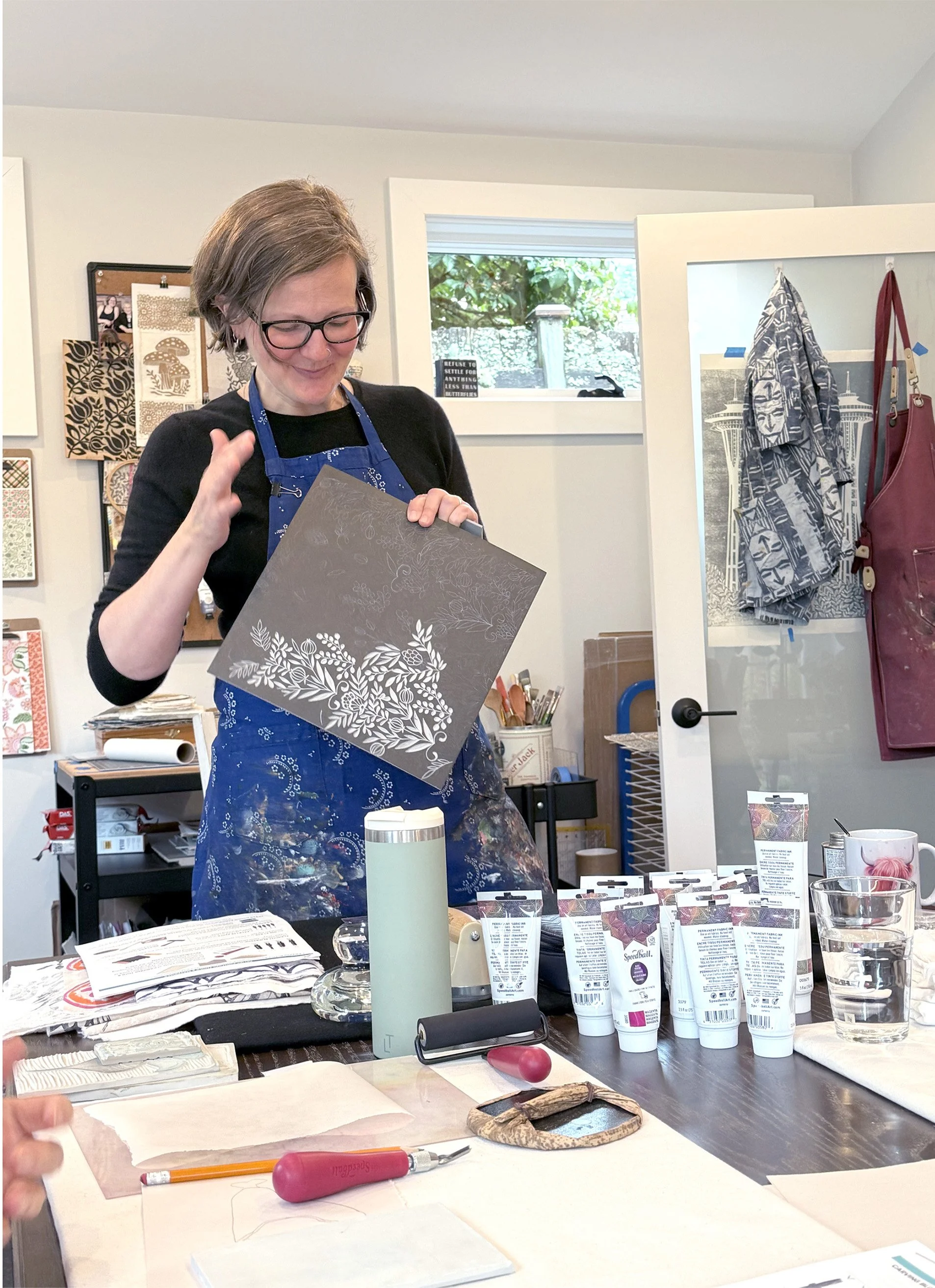 Diane Kappa holding a piece of cut linoleum with an intricate white floral and leaf pattern cutout, with a similar patterned paper underneath.